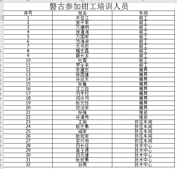 磐古實業鉗工培訓學徒名單